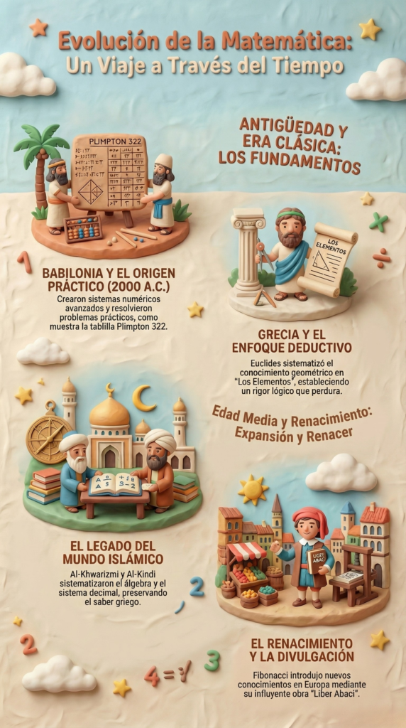 La historia de la matemática es una narrativa fascinante que se remonta a las civilizaciones antiguas, donde se establecieron las primeras nociones matemáticas. Entre estas civilizaciones, los babilonios son reconocidos por desarrollar un sistema numérico avanzado y por sus contribuciones a la geometría y la aritmética en torno al 2000 a.C. Su famoso tablón de arcilla, el Plimpton 322, evidencia el uso de conocimientos matemáticos en la resolución de problemas prácticos.
